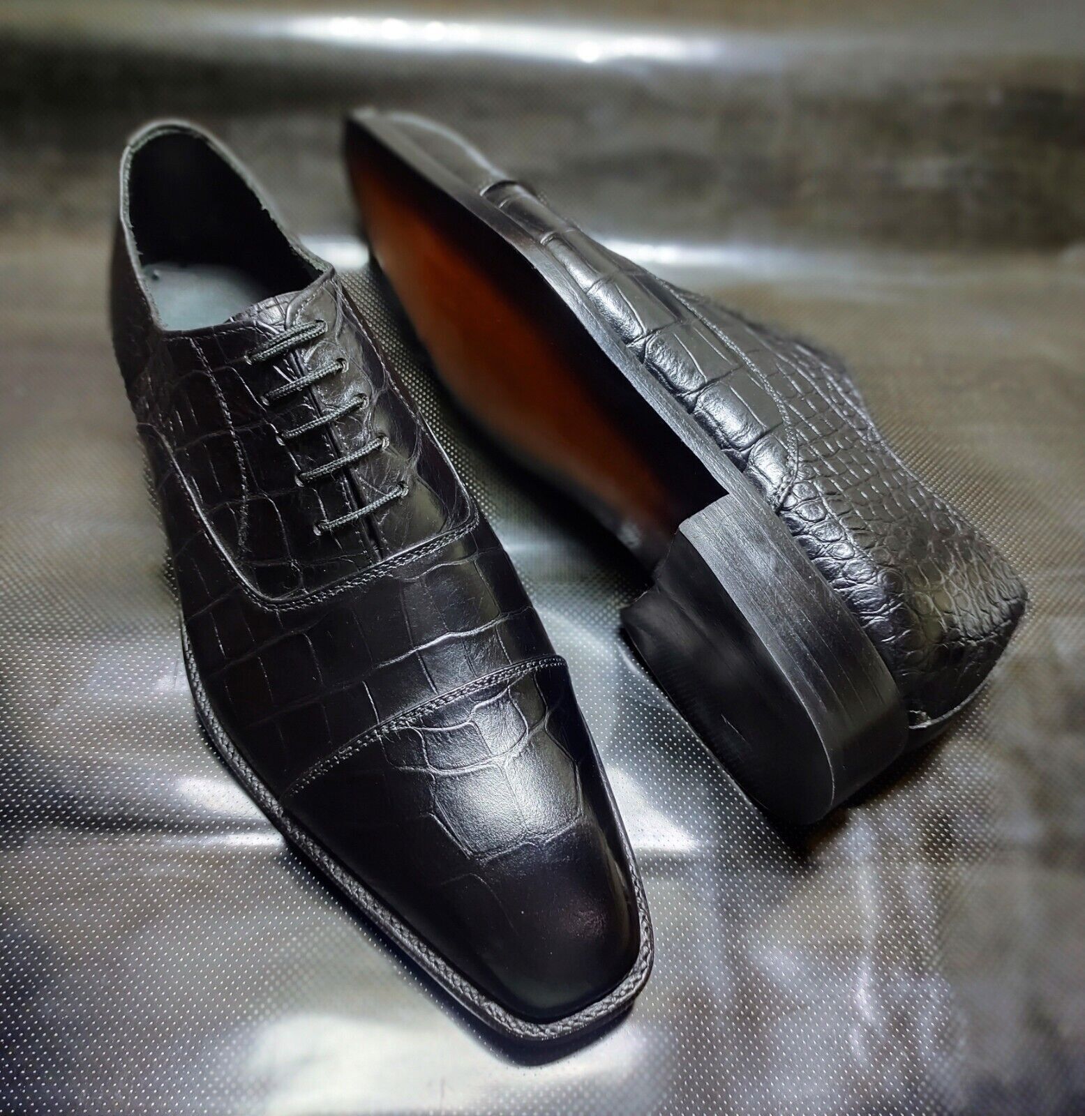 Men's Shoes Handmade Black Alligator Print Leather Toe Cap Lace Up Formal Boots